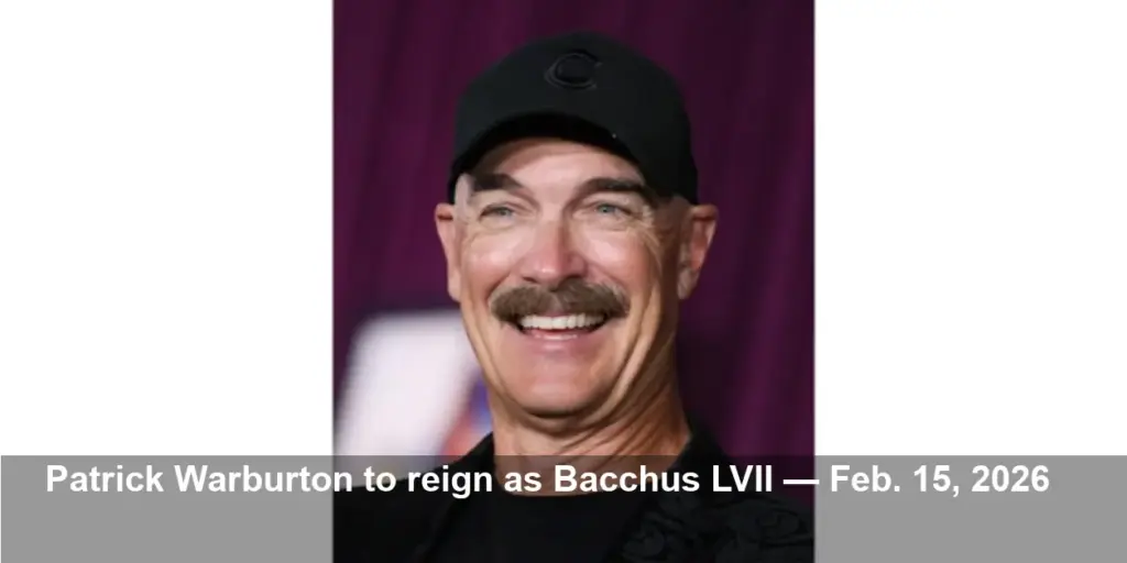 - Patrick Warburton will serve as Bacchus LVII on Sunday, Feb. 15, 2026.
