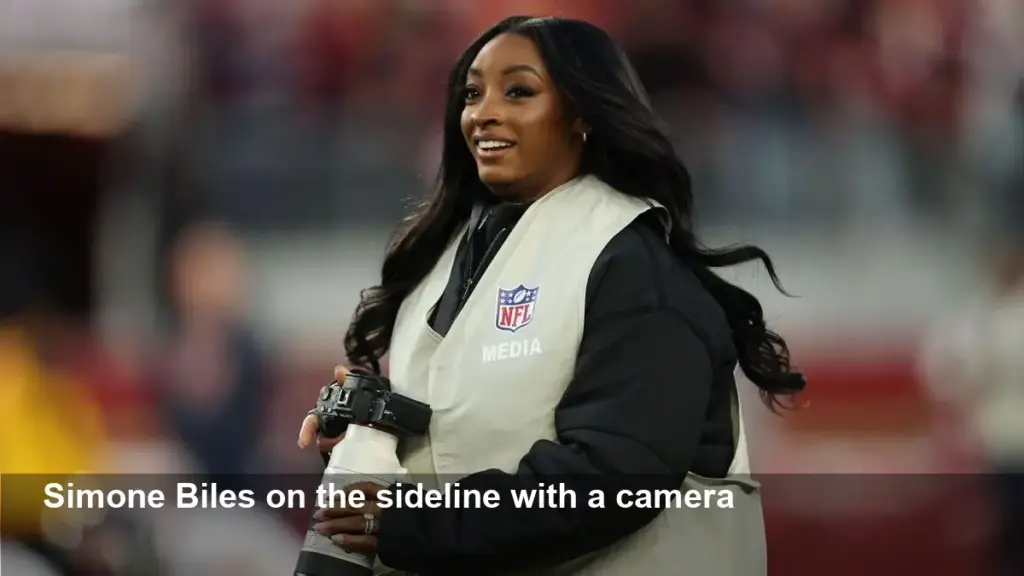 Simone Biles, the 11-time Olympic medalist, showed up at Sunday Night Football in a new role: credentialed photographer. Wearing an NFL media vest and carrying a Sony camera, Biles moved around the field at Levi’s Stadium while the San Francisco 49ers hosted the Chicago Bears.