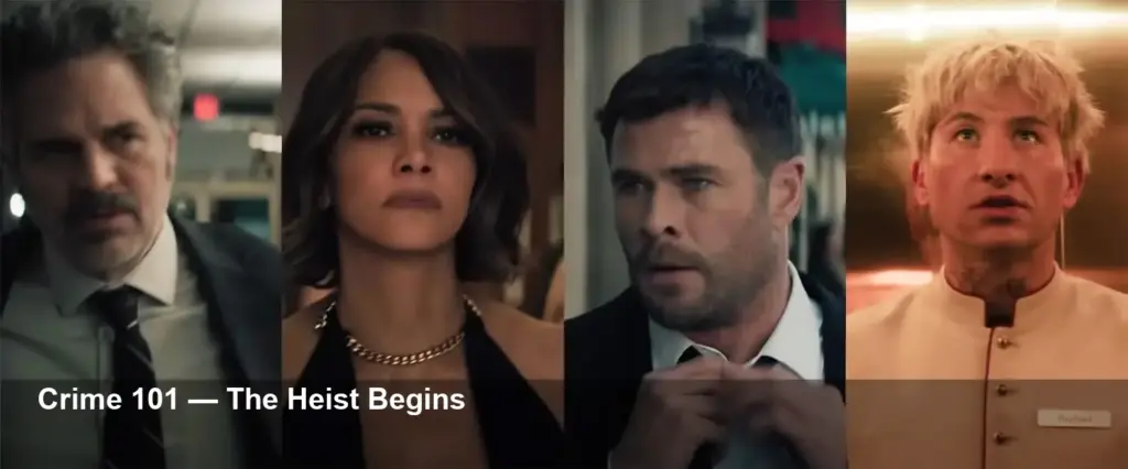 - Leads include Chris Hemsworth, Mark Ruffalo and Halle Berry; the thief follows strict “Crime 101” rules.