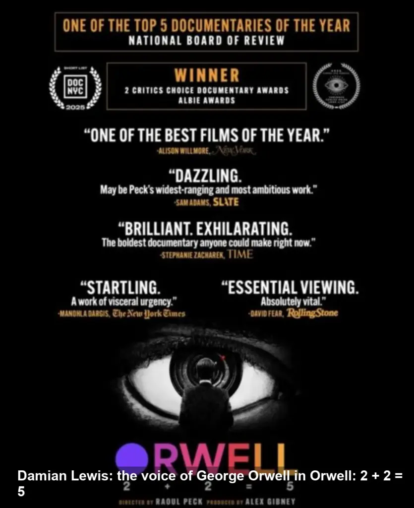 Damian Lewis supplies the intimate voice of George Orwell in Raoul Peck’s documentary Orwell: 2 + 2 = 5. The film premiered at the 2025 Cannes Film Festival and has drawn wide attention for its archival imagery, urgent themes and Lewis’s measured narration. Critics awarded the film Best Narration and Best Score at the Critics Choice Documentary Awards, while the National Board of Review listed it among the year’s top five documentaries.