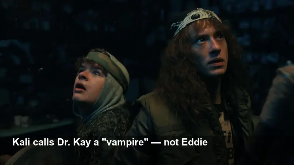 In Stranger Things season 5 episode 5, a line about a “vampire” surfaces — but it doesn’t reference Eddie Munson. Instead, Kali (Number Eight) tells Eleven that Dr. Kay repeatedly drained her blood during captivity and that the clinician felt “endless” in her need, prompting Kali to think of her as a vampire. The remark is figurative: Dr. Kay used Kali’s blood to continue Dr. Brenner’s experiments, including attempts to infuse pregnant women.
